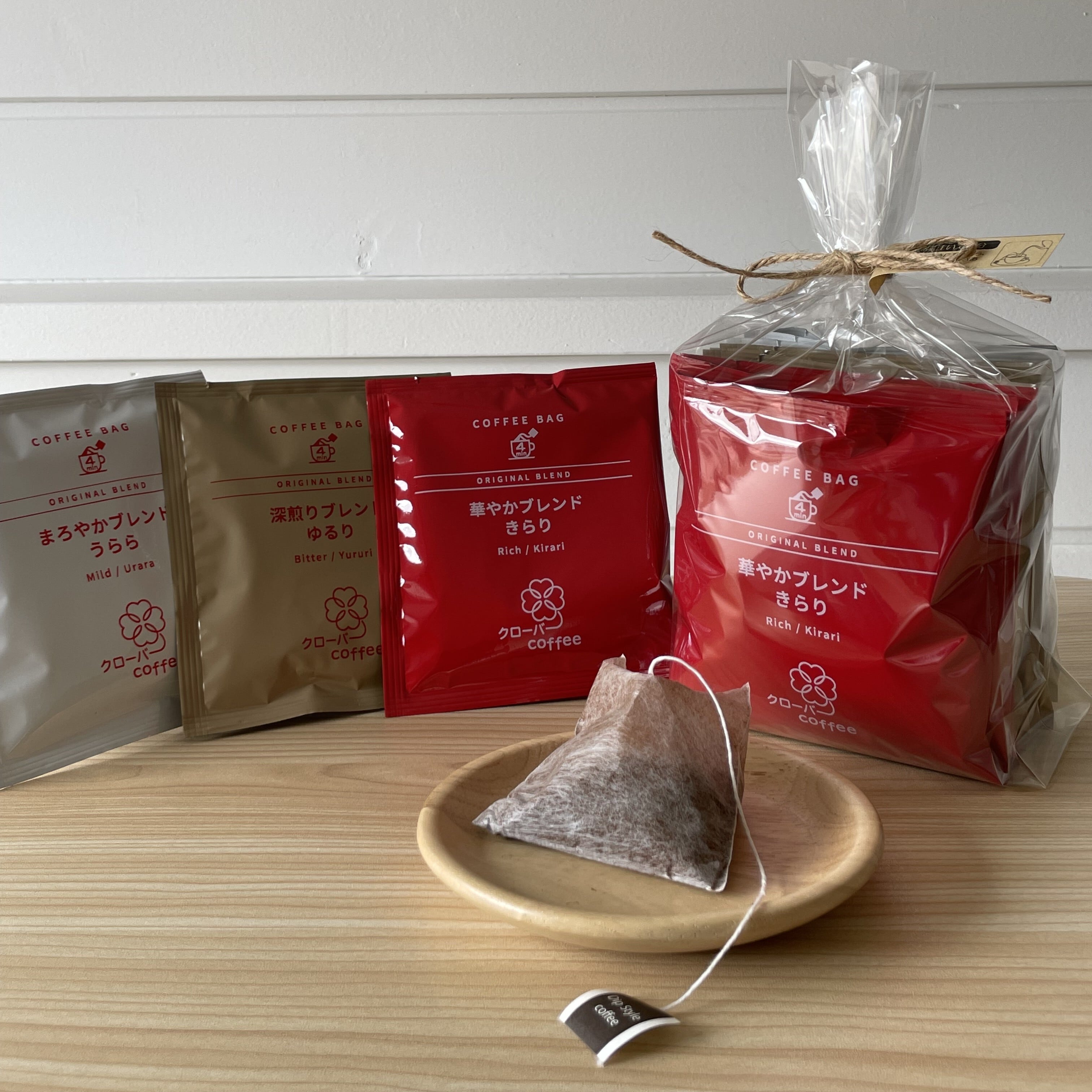 熱湯を注ぐだけのティーバッグスタイルです。まろやかブレンド うらら3個、深煎りブレンド ゆるり3個、華やかブレンド きらり4個入りです。